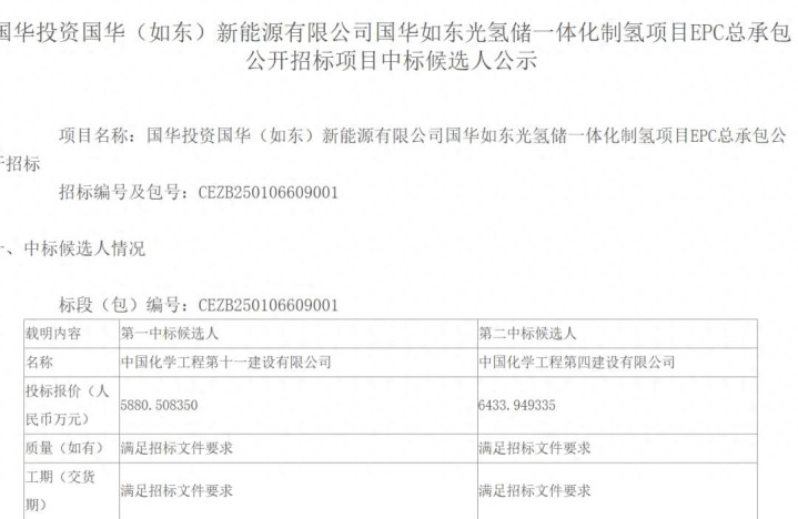 8月27日,国华投资国华(如东)新能源有限公司国华如东光氢储一体化制氢项目EPC总承包项目中标候选人公示: